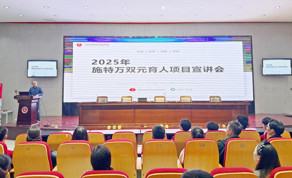 为深化产教融合,拓展学生成才路径,助力实现高质量就业,10月24日下午,我校在弘德报告厅举行“施特万双元育人项目”专场宣讲会。2025级机电技术系与机械工程系的百余名学生及家长齐聚一堂,共同探寻校企协同育人新模式。宣讲会由招生就业与社会培训处副处长杨玉慧主持。